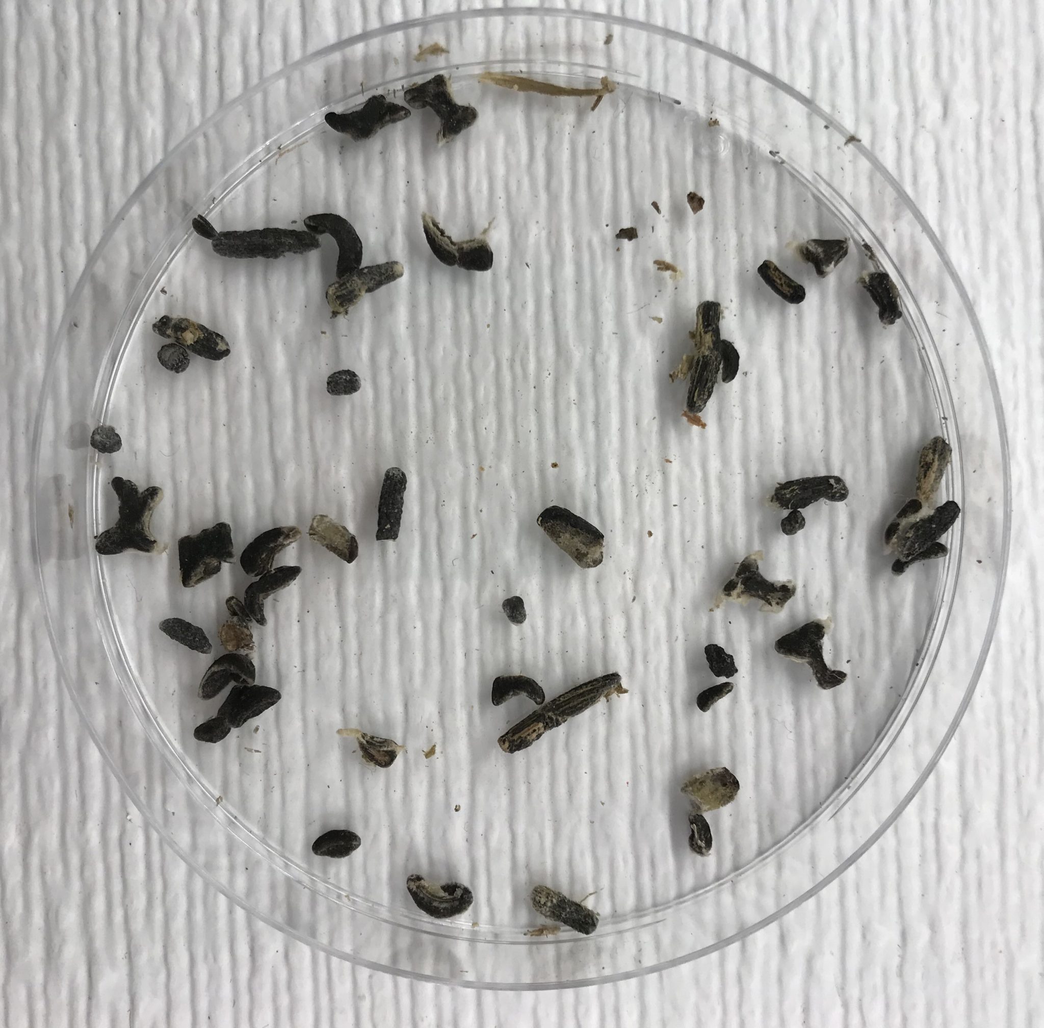 Description: Sclerotia of various shapes and sizes collected from infected plant in northeast Indiana. Approximate size of sclerotia.